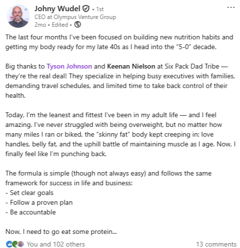 Hi, I'm Tyson Johnson, founder of The Six Pack Dad Tribe. In 2004, I went from 20% to 10% body fat and have maintained that year-round since as a busy entrepreneur dad. 270+ other dad execs & professionals have been through our founder-led health transformation program with a 96% success rate. Now it's your turn.